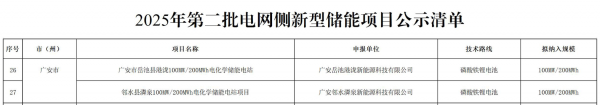 其中,港青能源公司旗下子公司广安岳池港泷新能源科技有限公司申报的《广安市岳池县港泷100MW/200MWh电化学储能电站》项目、广安邻水潾泉新能源科技有限公司申报的《广安市邻水县潾泉100MW/200MWh电化学储能电站项目》获批入选。
